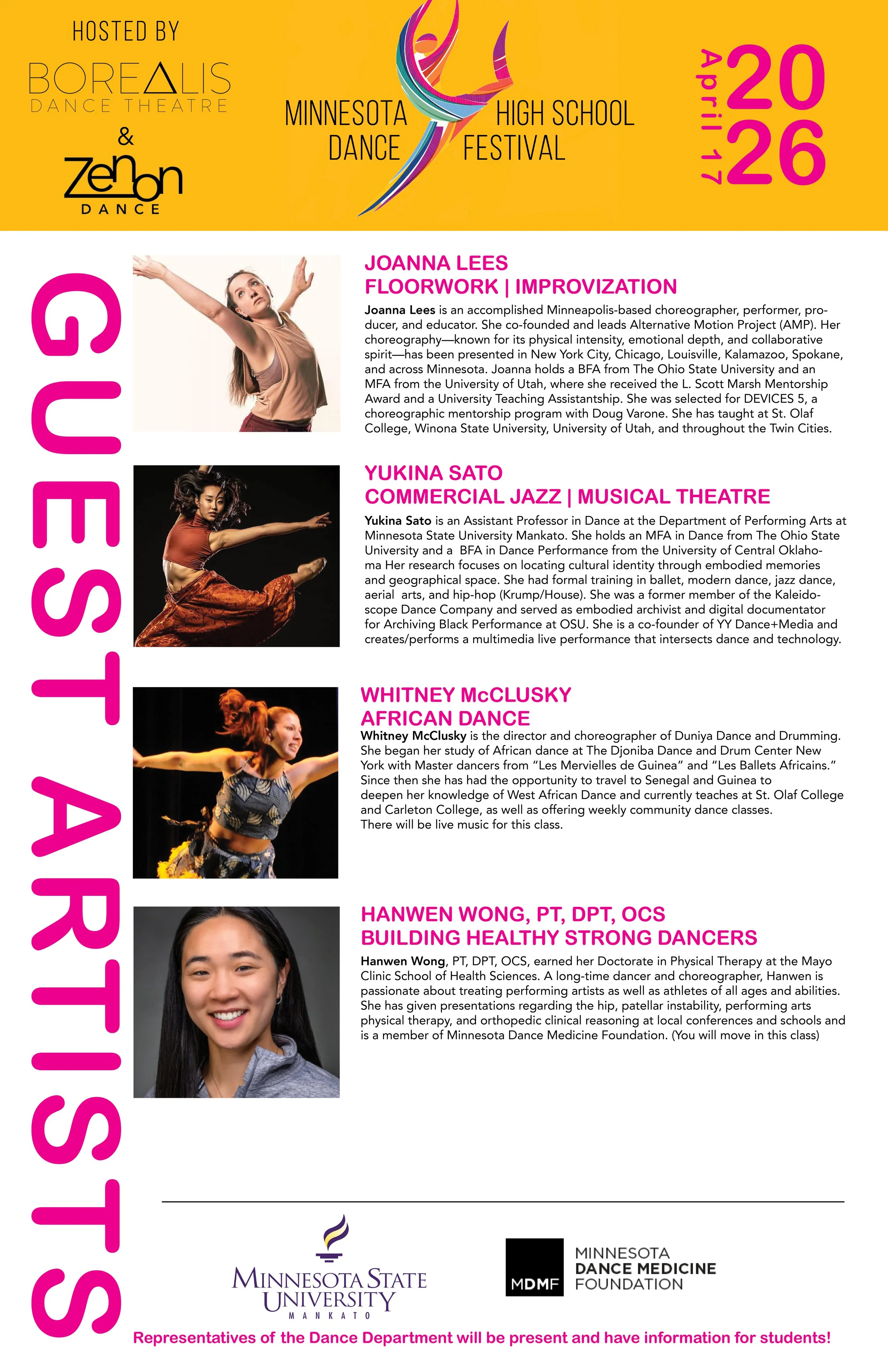 The Minnesota High School Dance Festival’s mission is to connect performing arts public high school students who are studying the art of dance. Young artists share in each other’s work and grow together as artists, dancers, and as a community through workshops and performances.